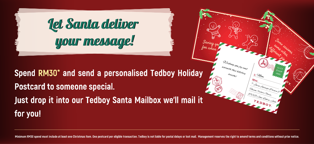 By spending a minimum of RM30, which includes at least one Christmas-themed item, you'll have the opportunity to send a Tedboy Christmas postcard to anywhere in Malaysia or internationally.